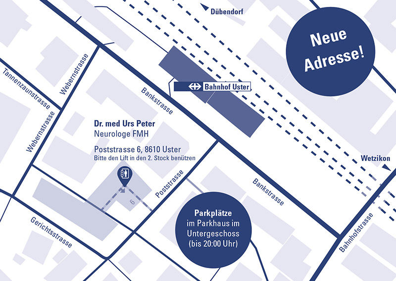 Die Praxis für Neurologie wird von Dr. med. Urs Peter weitergeführt und ist an die Poststrasse 6 in Uster umgezogen.